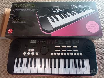 Vendo tastiera a batterie, mai usata, con fondo di colore rosa.