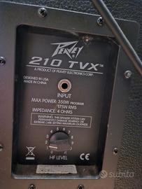 -Cabinet Peavey 210 TVX 2x10 Bass Speaker with Tweeter. Il cabinet per basso TVX 210 con struttura chiusa è dotato di due altoparlanti da 10" Sheffield® e un tweeter a cupola fenolica con attenuatore L-pad. Offre una risposta in frequenza da 30 Hz a 15 kHz e una potenza nominale di 350 watt (140€).