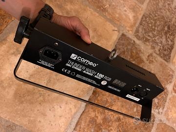Thunder Wash 100 RGB con strobo, blinder e wash in un'unica lampada. Dotata di 132 LED SMD RGB da 0,2 W, un angolo di proiezione di 80° e un alloggiamento compatto in metallo nero con staffa di montaggio universale.