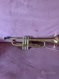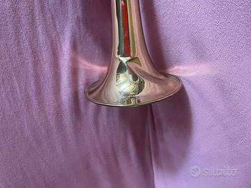 Ottime condizioni, anche se ha un'ammaccatura sul cono che non incide comunque sul suono. Bocchino performante, acquistato a parte dall'originale. Sordina compresa nel prezzo. Non c'è la custodia.