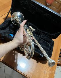 Vendo bellissimo esemplare di tromba in Sib, campana 37. Costruzione artigianale ispirata alla bach 37. Vendo per non utilizzo: l'ho comprata ma non l'ho mai imparata, mai uscita fuori casa, condizioni impeccabili, pari al nuovo, suonata per 30 minuti e poi riposta nella custodia. Custodia Rigida ben imbottita all'interno: contiene grasso e olio t2 che vedete in figura. Includo il bocchino 7c che si vede in foto. Spedizione eventuale a carico dell'acquirente.