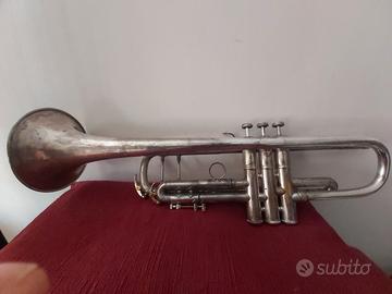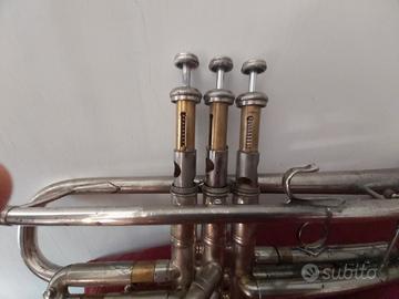 Tromba Bach Stradivarius modello 37 in condizioni di suonare ma da rivedere. Argentatura in cattive condizioni, manca l'anello sulla prima pompa e le chiavi dell'acqua non sono originali. Priva di custodia. Solo consegna diretta Roma zona Montesacro-Valmelaina.
