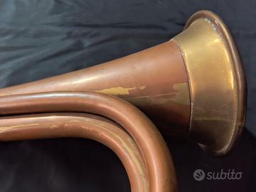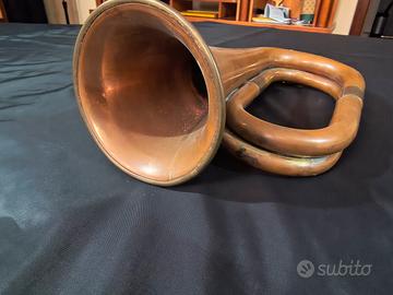 Vendo splendida tromba flicorno bugle da caccia antica in rame con dettagli in ottone, pezzo d’epoca dal grande fascino decorativo.