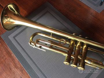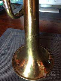 TROMBA FRANK HOLTON model COLLEGIATE sib realizzata a ELKHORN Wis. USA, canneggio ML, campana da 4e3/4, finitura laccatura gold con qualche segno del tempo! meccanismo rimando con molle superiori, tasti con madreperla originale, numero seriale 397000, pistoni in acciaio in buone condizioni, compressione valida, doppia chiave acqua su 1 e 3 pompa, bellissima finitura dei due embrace, regolazione corsa terza pompa intonazione con blocco sotto il finger, lead-pipe finitura in nickel, con poche e lievi ammaccature, complessivamente in ottime condizioni, suono accurato e dinamico, come si conviene ad una realizzazione anni 50-60 made in USA.