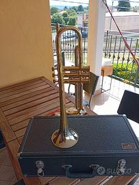 Vendo fantastica tromba pari al nuovo (no graffi e bolli) colore oro e argento. Lo strumento è molto bello grazie ad un disegno inciso sulla campana, alla sua colorazione bicolor e alle valvole di scarico acqua a bottone. A corredo c'è la custodia nera anch'essa ben tenuta, una imboccatura in ottime condizioni, due metodi di studio, una sordina realizzata in stampa 3d ed un letturino di fabbricazione artigianale ma ben realizzato, stabile e funzionale. Accetto scambi con flicorno soprano.