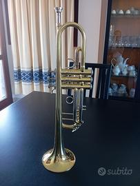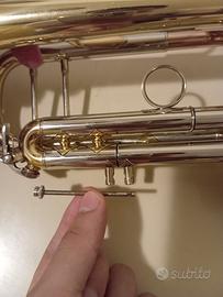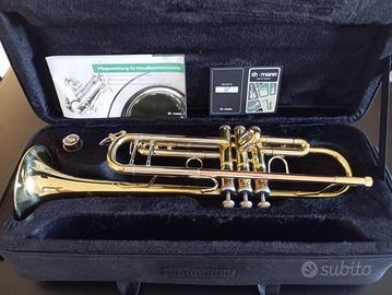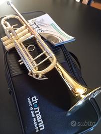Tromba in si bemolle, marca Thomann modello tr-500L. Lo strumento è come nuovo, senza macchie, graffi o ammaccature. Si è solamente rotto (staccato) il freno della chiave dell'acqua piccola (come si vedi nella stessa foto) . Si può comunque suonare benissimo. Bocchino C5 compreso