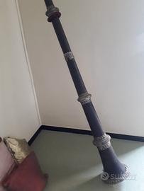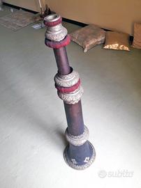 Antica tromba tibetana DUNG CHEN. Autentica, ultrasecolare, originaria di un monastero del Tibet. Uno dei reperti più importanti della mostra "Il tesoro della saggezza dei quattro tantra" tenuta a Genova, Museo Civico delle Culture del Mondo, Castello D'Albertis, 22 ottobre 2016 - 29 gennaio 2017. Funzionante, produce il suono "barrito dell'elefante". Strumento di preghiera impiegato nelle tradizionali "Puje" (riti e cerimonie del buddismo tibetano). Di rame e argento, finemente decorata, lunghezza metri 2,90, telescopica . Ancor oggi suonata nei monasteri dell'Himalaya; è un oggetto che dona un tocco spirituale ed evocativo in ogni situazione.