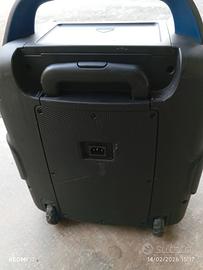 cassa portatile usata poche volte in casa , a batteria lunga durata, con bluetooth, USB, aux, scheda, cassetto per microfono, riverbero , eko ,due attacchi Canon per microfoni, maniglia telescopica per trasporto, casse anche intorno ai lati .