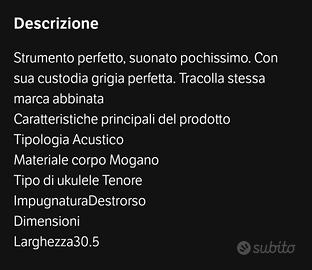 Strumento perfetto, suonato pochissimo. Con sua custodia grigia mai usata. Tracolla stessa marca abbinata. Strumento acustico Corpo in mogano Larghezza 30,50