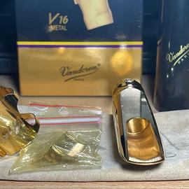Vendo per non utilizzo, ed in perfette condizioni, becco per sax tenore Vandoren V16 metal, apertura 6, camera larga. Sono compresi nella vendita, legatura Optimum (con tre placche), cappuccio in plastica e scatola.