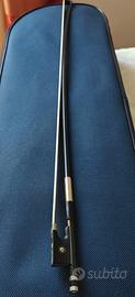 Archetto ottagonale in fibra di carbonio intrecciata, bacchetta rotonda, crini naturali, nasetto in ebano con intarsio madreperlato, avvolgimento in alluminio.