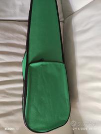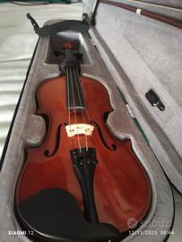 Set completo di violino 2/4. Il violino ha il top in abete massello e le fasce e il fondo in acero massello. La montatura è in pero tinto con filetto a intarsio.