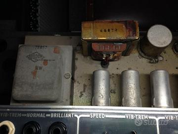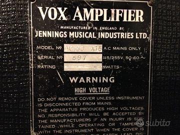 Vox AC30 Top Boost del 1964, originale e integro, rarissima versione Special Bass Frequencies, ovvero Expanded Frequency, per cui monta due altoparlanti da 15" (38 cm.) della Celestion detti Spider Frame per la forma del cestello. Fornito del pedale originale Egg Shape che attiva il tremolo o il vibrato, è pieno di valvole vintage e sfoggia tre canali: normal, tremolo/vibrato e brilliant.