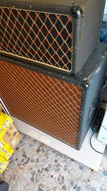 Vox AC50 testata Anni 60 (4 valvole sul Pre, 2 Finali e 1 Rettificatrice) e Cassa Vox monta 4x12 Greenbacks. Ottimo suono 1600 entrambe o 800 a pezzo. Testata revisionata di recente, in perfette condizioni operative, trasformatori originali; il tutto risulta abbastanza vissuto come si può vedere dalle foto, ma di straordinario valore. Ottimo suono per gli amanti dei Vox.