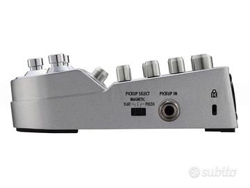 Pedale Preamp/Effetti per chitarra acustica - 40 Effetti utilizzabili in qualsiasi combinazione - Alimentazione: 8x Batterie AA (8 ore di funzionamento), alimentatore AD-16 (incluso), bus USB - Funzionalità Direct Box con uscita XLR bilanciata - Preset di rimodellamento per 16 tipi di body e 28 modelli di chitarre acustiche - Footswitch Anti-feedback che filtra fino a 3 intervalli di frequenza contemporaneamente - Crea e memorizza fino a 20 Patch - Accordatore cromatico integrato.