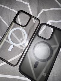 Cover per iPhone 15 Pro Max, disponibili in due varianti: una trasparente con bordo nero e una nera opaca.