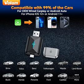 "SENZA SCATOLA" AQUISTATO USATO 3 VOLTE E RIPOSTO IN CASA , PER CAMBIO AUTO CON ANDROID WIRELESS DI FABRICA. PERCIO' E' PARI AL NUOVO. PAGATO 34 EURO SU NOTO SITO DI VENDITE ONLINE "A****N". Volam 2 in 1 Adattatore per Carplay Android Auto, Wireless Converte Carplay Android Auto cablato di fabbrica senza fili, adatto per Audi/VW/Opel/Citroen (2016+), 5 GHz WiFi WIFI 5GHZ, trasmissione veloce: la tecnologia WiFi 5GHz garantisce una trasmissione dati veloce e stabile e un chip 5G integrato migliora la ricezione per un'esperienza di navigazione ininterrotta. Goditi una navigazione fluida, chiamate in vivavoce e streaming musicale con la sua elevata velocità di elaborazione, rendendo ogni viaggio comodo e divertente. Aggiorna subito la tua auto con l'adattatore wireless Volam 2-in1 Carplay e Android Auto. PLUG AND PLAY: l'adattatore per auto wireless Volam Carplay e Android Auto è un ottimo accessorio per migliorare la tua esperienza di guida. Plug and Play è una soluzione comoda e semplice per connettere il tuo telefono iOS o Android alla tua auto Carplay o Android Auto cablata (anni modello: dal 2015 al 2024), garantendo la perfetta connessione tra la tua auto e il tuo smartphone. Ampia compatibilità: l'adattatore per auto Android wireless Volam è compatibile con il 98% delle auto sul mercato che supportano Carplay cablato e Android Auto. Prima dell'acquisto, puoi collegare il telefono all'auto tramite un cavo dati per verificare che puoi utilizzare Carplay o Android Auto. Per ottenere prestazioni ottimali, si consiglia iOS 7.1 e versioni successive e Android 11 e versioni successive. Facile da trasportare: con il suo design compatto e leggero, questo adattatore wireless Volam per Carplay e Android Auto non occupa spazio ed è facile da trasportare ovunque tu vada. Dì addio a fili aggrovigliati e cavi disordinati. Inoltre è dotato di una comoda funzione di archiviazione, questo innovativo adattatore riconosce automaticamente il tuo telefono dopo il primo accoppiam