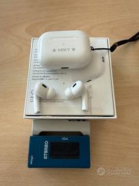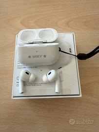 🎧 Apple AirPods Pro 2ª gen – USB-C – Scatola originale completa Vendo AirPods Pro (2ª generazione) con custodia MagSafe USB-C. Funzionano perfettamente. Stato: Usate, buone condizioni. La custodia presenta normale usura da utilizzo e un'incisione laser personalizzata ("MIKY") sul frontalino — visibile nelle foto. Gli auricolari sono in ottime condizioni. Cosa è incluso: AirPods Pro 2ª generazione Custodia MagSafe con connettore USB-C Scatola originale Apple completa di tutti gli inserti Laccio per la custodia Cover Elago in silicone (bonus!) Caratteristiche: Cancellazione attiva del rumore (ANC) Modalità Trasparenza adattiva Audio Spaziale personalizzato Resistenza all'acqua IPX4 Ricarica MagSafe e USB-C