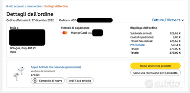 ORIGINALE originale le Airpods sono originali, acquistate su Amazon.it, nelle foto c'e' lo screenshot dell'acquisto Edit: ho sbagliato ad inserire l'annuncio indicando che l'airpod guasta era la destra, quando invece l'airpod guasta e' la SINISTRA, segue l'annuncio corretto: Vendo le mie AirPods Pro 2, sono originali acquistate su amazon a fine dicembre 2022, mai avuto problemi con le sue funzionalita' tipo cancellazione del rumore o trasparenza e ci avevo pure attivato sopra l'applecare. l'airpod SINISTRA non funziona piu' purtroppo, per questo motivo sono passato al nuovo modello (che mi sta peggio nelle orecchie e rosico). Con l'airpod guasto riesco ad associarle al mac ma la sinistra ogni tanto viene vista e poi sparisce, la destra funziona. sono sempre state tenute con la custodia inclusa e non hanno dato segni di squilibrio finche' la SINISTRA non ha deciso di morire per cause non traumatiche, sospetto fosse un problema di batteria ma non posso sbilanciarmi piu' di cosi'.. Cosa c'e' nella vendita: - Scatola originale airpods con contenuto originale (custodia, 2 airpods e gommini - NON c'e' il cavetto - ci sono i gommini originali di cui ho usato solo gli M, degli M nuovi montati sulle cuffie e un ulteriore paio di M mai usati. - case Ringke con relativa scatola (e forse anche il moschettone) Volendo spedisco NB: l'AirPod SINISTRA non da' segni di vita, per questo motivo ho inserito l'oggetto come "Danneggiato - Con parti guaste", ma il resto e' ok e lo ho mantenuto in carica in modo che non avesse problemi. ciao Teo