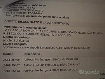Vendo, per passaggio al modello successivo, AirPods pro 2a gen. sostituite (Apple, sia case sia auricolari) in assistenza MediaWorld a Luglio 2025. Scadenza garanzia Giugno 2026
