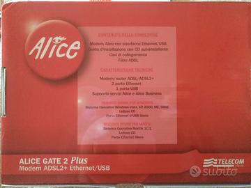 Vendo Alice Gate 2 Plus Modem ADSL2+Ethernet nuovo mai usato ancora nella sua confezione originale. Il Conte comprende Modem Alice interfacce Ethernet/USB - Giuda d'installazione con CD autoinstallante - Cavi di collegamento - Filtro ADSL