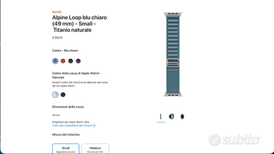 Vendo cinturino Apple originale modello Alpine Loop, colore blu chiaro, misura small, nuovo e mai utilizzato, in confezione originale aperta solo per verificarne il contenuto.