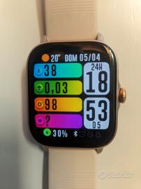 in ottimo stato usato e con cura. assieme alla scatola ed al cavetto di ricarica invio due cinturini aggiuntivi uno in silicone nero ed uno in metallo color oro