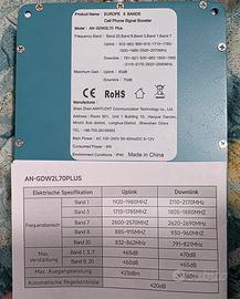 Amplificatore segnale cellulari - bande 1/3/7/8/20 per 5G 4G 3G LTE gsm - tutti operatori NUOVO, inscatolato, mai aperto mai usato. Valore: 279,00 marca ANNTLENT Guadagno 70dB Supporta tutti gli operatori italiani come TIM, Wind Tre, ecc. mod. AN-GDW2L70PLUS Supporta le bande 1/3/7/8/20. vedi in foto i dettagli delle frequenze. Antenna omnidirezionale riceve segnali da tutte le direzioni a 360°. Accessori completi, plug and play. Dotato di un display LCD ad alta definizione