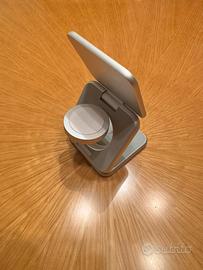Caricabatterie magnetico wireless per smartphone, smartwatch e cuffie; compatibile con Apple Watch; materiale alluminio, colore argento; incluso caricatore, cavo di ricarica USB-C e custodia da viaggio.