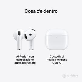 Apple AirPods 4 Auricolari wireless, Auricolari Bluetooth, Cancellazione attiva del rumore, Audio adattivo, Trasparenza, Audio spaziale personalizzato, Custodia di ricarica USB-C, Ricarica wireless