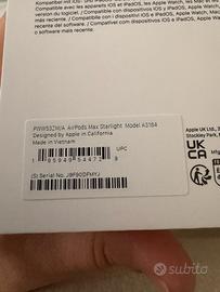 Vendo AirPods Max originali Apple, colore Starlight, modello A3184. Le cuffie sono mai aperte, mai utilizzate e ancora sigillate nella confezione originale. 📅 Acquisto: novembre 2025 🎁 Motivo della vendita: erano un regalo, ma possiedo già un altro paio. 📦 Condizioni: scatola perfettamente integra. 🔍 Verifica originalità: seriale visibile in foto. 💰 Prezzo poco trattabile 🤝 Consegna a mano in zona