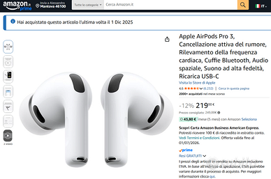 ATTENZIONE LEGGI BENE PRIMA DI SCRIVERMI SE VEDI L'INSERZIONE SIGNIFICA CHE L'OGGETTO E' DISPONIBILE NON ACCETTO OFFERTE AL RIBASSO per passaggio a Apple AirPods Max 2 metto in vendita queste Apple AirPods Pro 3 acquistate in dicembre 2025 mai utilizzate solo testate quindi realmente nuove funzionanti e ancora in garanzia + custodia in omaggio prezzo già fortemente scontato per vendere rapidamente al più veloce
