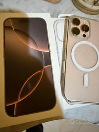 APPLE iPhone 16 pro 256 gb sabbia oro deserto Come nuovo con cover originale mag safe e pellicola vetro temperato , batteria al 87%! Scatola accessori e fattura Unieuro ! In Garanzia fino a settembre 19/09/2026! ATTENZIONE: spedizione o Consegna a mano previo pagamento anticipato Grazie