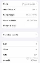 Vendo iPhone 13 Pro con memoria da 128GB, perfettamente funzionante e in ottime condizioni. Lo smartphone è sempre stato tenuto con cover e pellicola protettiva. Interamente originale, nessun componente sostituito. Caratteristiche Principali: Display: 6,1" Super Retina XDR con tecnologia ProMotion (120Hz) per una fluidità massima. Processore: Chip A15 Bionic, ancora oggi tra i più potenti sul mercato. Fotocamere: Sistema Pro da 12MP (Teleobiettivo, Grandangolo e Ultra-grandangolo) con Modalità Cinema, Macro e video in ProRes. Batteria: Stato batteria al 86%. Sicurezza: Face ID perfettamente funzionante. Connettività: 5G, Wi-Fi 6 e supporto MagSafe. Incluso nel prezzo: Scatola originale e cavo di ricarica. Prezzo Euro 390 NON TRATTABILI, consegna a mano "Como/Varese". Possibilità di spedizione "gestita da subito.it". Per informazioni contattatemi.