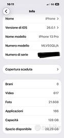 Apple iPhone 13 Pro 128 GB colore nero graffite. Tenuto sempre con custodia e pellicola protettiva. Batteria residua al 83%. Fattura del febbraio 2022. Riceve ancora tutti gli aggiornamenti di Apple. Scatola e accessori originali. Posso spedire ma preferisco scambio a mano a Piacenza zona galassia. Spedizione a carico di compra pagamento anticipato tramite bonifico bancario.Poco trattabile.