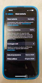 Come da titolo vendo smartphone Apple iPhone 15 PRO 128GB in colorazione Blu. Il telefono è stato usato pochissimo come si può vedere dai cicli di ricarica effettuati. È sempre stato utilizzato con pellicola protettiva e cover e non presenta graffi,segni usura o difetti né sul display né sulla scocca. Mai caduto. La garanzia è valida fino al 12/05/2026. Non si tratta di prodotto rigenerato ma acquistato nuovo. Il prezzo ovviamente tiene conto di tutti questi fattori, evitate quindi proposte oscene.