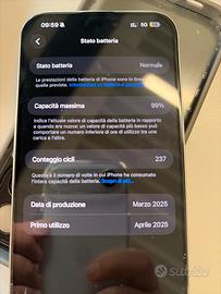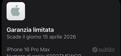 Vendo IPhone 16 pro Max 256GB per passaggio a 17. Il telefono é perfetto, sempre curato con batteria al 99% come da immagini. Primo utilizzo Aprile 2026, scocca perfetta senza segni evidenti di usura e graffi. Touchscreen perfettamente funzionante senza alcun difetto o incrinatura. Vendo in confezione originale con cavo e scontrino di acquisto al negozio.