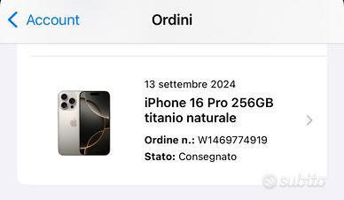 Vendo iPhone 16 Pro di colore Titanio Naturale con 256 gb di memoria. Prodotto originale Apple. Telefono pari a NUOVO. Batteria con 322 cicli di ricarica con capacità massima 94%. Cedo insieme alla sua scatola originale. Prodotto acquistato il 13 settembre 2024 in preorder sul sito Apple.