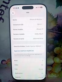 iPhone 17 Apple 256 giga memoria colore verde azzurro con custodia a libro e vetro di protezione acquistato in data 20/04/2026 scade garanzia 19/04/2027 nuovo con scatola carica e chiavetta aprí sportello sim acquistato a Santambrogio valpolicella da Expert Leso disponibile a Verona