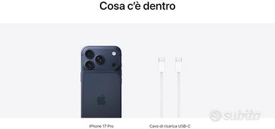 ✅ Descrizione prodotto Vendo iPhone 17 Pro 512 GB, diverse colorazioni disponibili tra Blu Profondo, Argento e Arancione Cosmico, nuovo e sigillato, mai aperto e mai attivato. Prodotto originale Apple con garanzia ufficiale Italia. Perfetto per chi cerca prestazioni al top, qualità fotografica professionale e grande capacità di archiviazione. --- 🔹 Caratteristiche principali Modello: iPhone 17 Pro Capacità: 512 GB Condizione: Nuovo – Sigillato Garanzia: Ufficiale Apple SIM: Dual SIM (eSIM + Nano SIM) Connettività: 5G, Wi-Fi 7, Bluetooth 6.0, NFC --- 🔍 Specifiche Tecniche 📱 Display Tipo: ProMotion XDR Dimensioni: 6,3" Tecnologia: OLED Frequenza di aggiornamento: fino a 120Hz Risoluzione: 2796×1290 (460 ppi) Protezione: Ceramic Shield avanzato ⚡ Prestazioni Chip: Apple A19 Pro CPU: 8-core GPU: 8-core Neural Engine di nuova generazione 📸 Fotocamere Tripla fotocamera posteriore: 48MP Grandangolo 48MP Ultra-grandangolo 64MP Telefoto Zoom ottico fino a 10x Registrazione video: 4K ProRes 8K 30fps Modalità Notte avanzata Fotocamera frontale: 24MP 🔋 Batteria Autonomia durata giornata Ricarica rapida USB-C Supporto ricarica wireless MagSafe 🔊 Audio Altoparlanti stereo ottimizzati Audio Spaziale 📦 Contenuto della confezione iPhone 17 Pro Cavo USB-C Documentazione Apple --- 🔐 Sicurezza Face ID avanzato Secure Enclave --- 🧊 Materiali & Design Scocca in Titanio grado aerospaziale Impermeabilità IP68 --- 🚚 Spedizione & Consegna Spedizione veloce e tracciata Imballaggio accurato