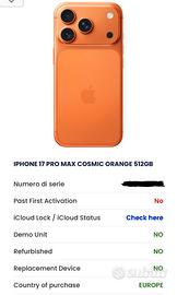 Vendo Apple Iphone 17 Pro Max colore arancione da 512gb di memoria. Il telefono è Nuovo Sigillato ancora da aprire e attivare. Vendo perché ne possiedo già uno da 1tb. Il Dispositivo ha 12 mesi di garanzia con apple dopo l’attivazione con possibilità di attivare l’AppleCare. Insieme Regalo cover e vetrino. —> Evitare perditempo e offerte ridicole, non scambio. preferibile consegna a mano e pagamento immediato. Grazie
