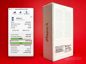 Vendo dalla mia collezione Apple iconico iPhone 4 (Model A1332 - MC604DN/A) da 16 GB in colorazione White usato e perfettamente funzionante, prodotto il 20-giu-2011.