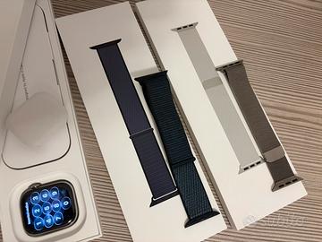 Apple Watch 11 titanio naturale da 42mm, come nuovo, 6 mesi di vita, ancora in garanzia, vetro zaffiro perfetto e cassa in titanio perfetto privi di segni, stato batteria 100%, con cinturino loop maglia milanese naturale per occasioni eleganti e un’altro sport loop blu per lo sport il tutto originale Apple e usato poco.