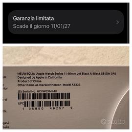 Vendo causa inutilizzo Apple Watch 11 46 mm jet black, cinturino sport taglia S/M, in garanzia fino a gennaio 2027 e stato batteria 100%. In perfette condizioni come da foto, completo di tutto il suo corredo, no scontrino di acquisto. Prezzo poco trattabile.