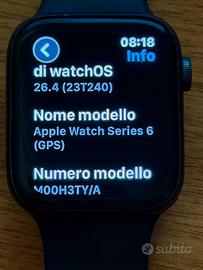 Apple Watch Serie 6 (GPS, 44 mm), cassa in alluminio, grigio siderale con Cinturino Sport nero originale, watchOS 26.4, usato pochissimo, batteria nuova (capacità 100%), completo di cavo di ricarica originale. 110,00
