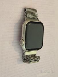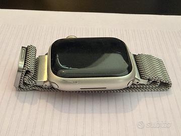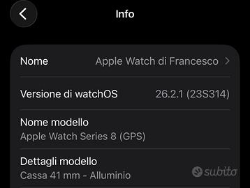 Apple Watch serie 8 con cassa da 41 mm in alluminio, capacità 32GB. In ottime condizioni, presenta un solo graffio sulla cassa lato sx. Sempre tenuto con pellicola, vendo con scatola originale, caricabatteria e 3 cinturini (uno maglia milano magnetica, 2 in stoffa per l’estate) e kit pellicole.