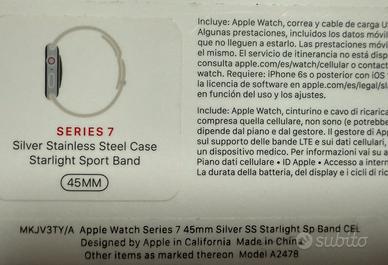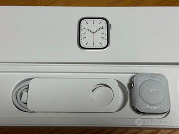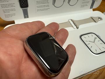 Apple Watch serie 7 da 45mm, cassa in acciaio e vetro zaffiro in ottime condizioni, nessun segno evidente. Completo di scatola e vari cinturini.