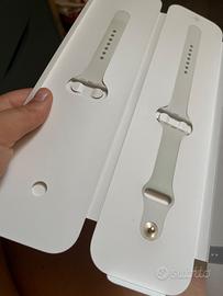 - cinturino sport borchia in acciaio inossidabile in taglia S/M e M/L in gomma bianca 41mm —> il cinturino S/M lo ho usato molto quindi il colore é un po’ macchiato, come si vede in foto; invece quello M/L é come nuovo, mai stato usato.