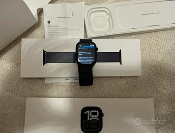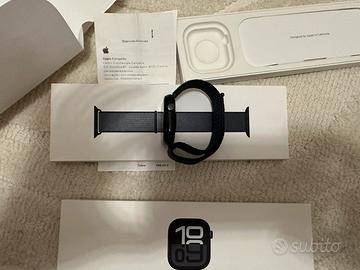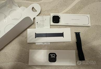 Vendo apple watch 46 mm serie 10 jet black, con cinturino sport loop in ottime condizioni estetiche e batteria al 97%. Scatola e accasori compreso anche scontrino apple con garanzia. Regalo anche cinturino in metallo nero aftermarket.