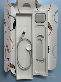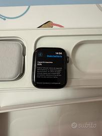 Apple Watch series 6 da 44mm. Compreso di scatole originali, cavo di ricarica e batteria all'83%. Cinturino originale doppio (taglia s/m e m/l). Essendo usato presenta qualche segno di usura, ma è correttamente funzionante. Come da immagine si può vedere un graffio sul display e qualche graffio laterale.